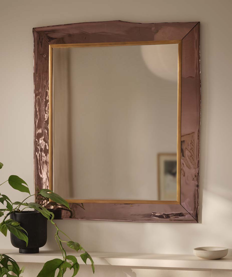 Made from cylinder drawn glass, these glass sheets have a lovely irregular undulation. The sheets do not come with a straight edge, so are normally cut square and the edge is discarded, but the beauty of the edge is a soft rolled finish which we decided to recylcle and use as the borders for this striking and unusual organic like mirror.