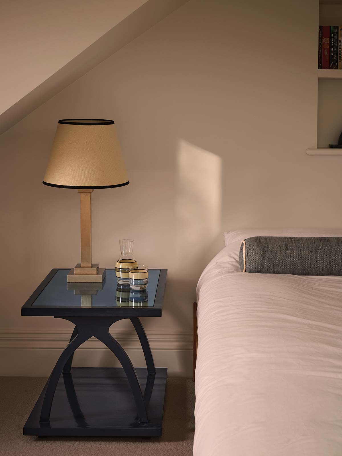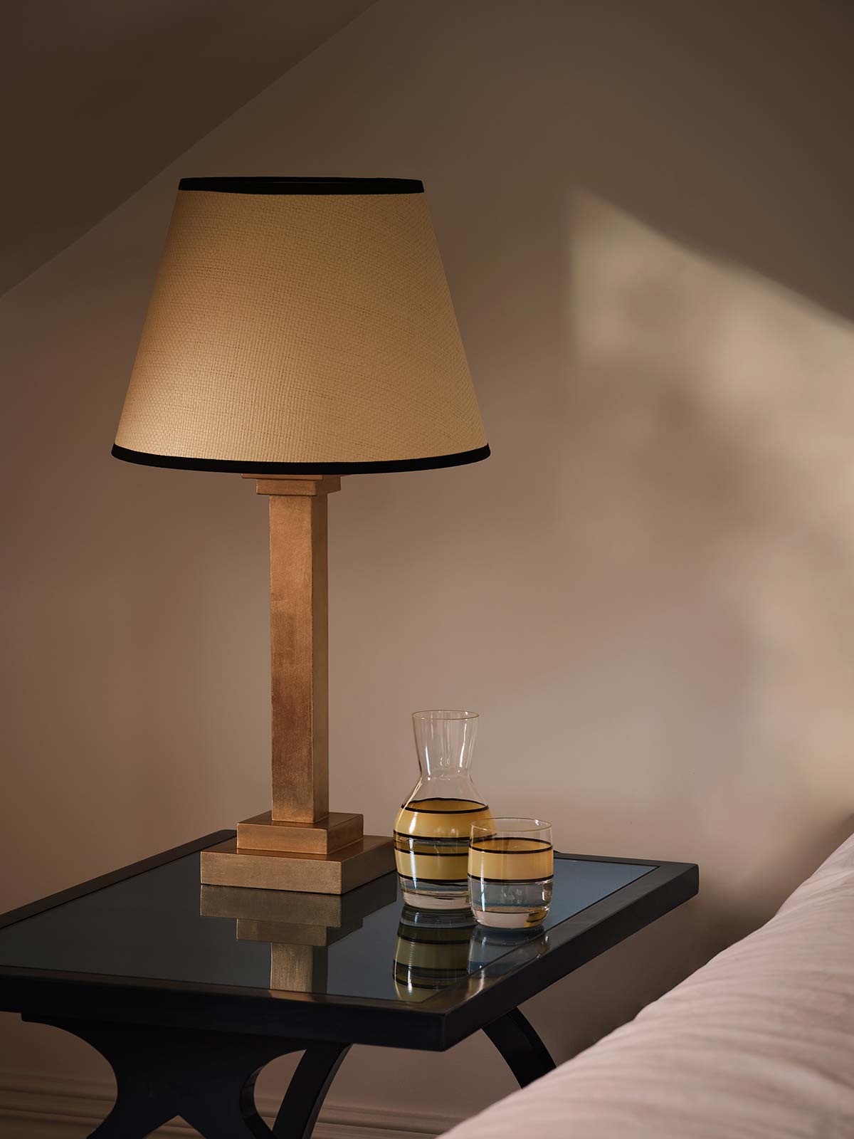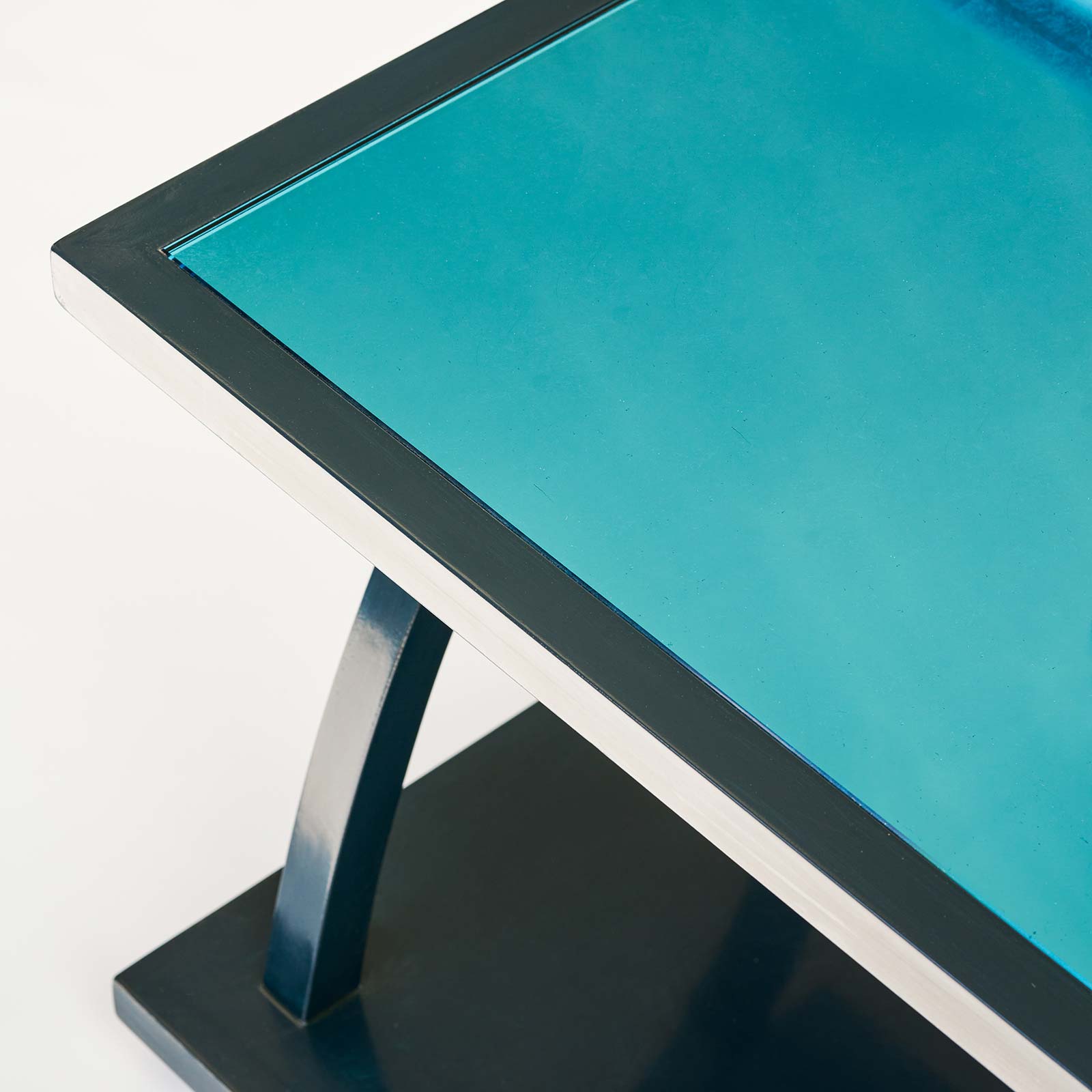 Drawing inspiration from Giacometti’s design for Jean-Michel Frank, the M-Table combines sculptural form with function. The hand-applied lacquer and silver leaf blue glass inset top give it depth and movement, while its tapering feet create the illusion of a floating silhouette.