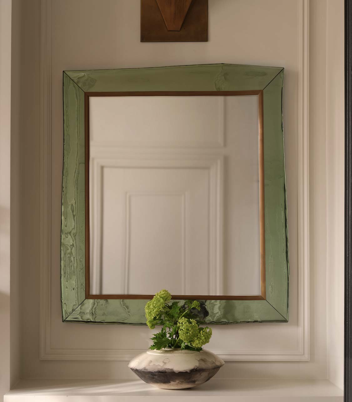 Made from cylinder drawn glass, these glass sheets have a lovely irregular undulation. The sheets do not come with a straight edge, so are normally cut square and the edge is discarded, but the beauty of the edge is a soft rolled finish which we decided to recylcle and use as the borders for this striking and unusual organic like mirror.